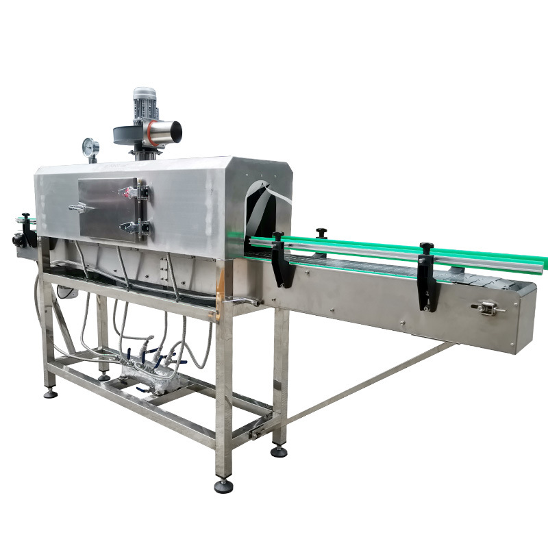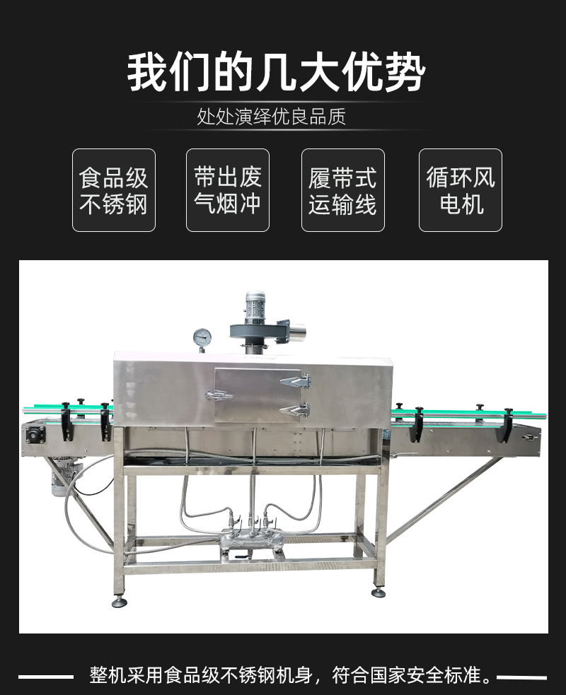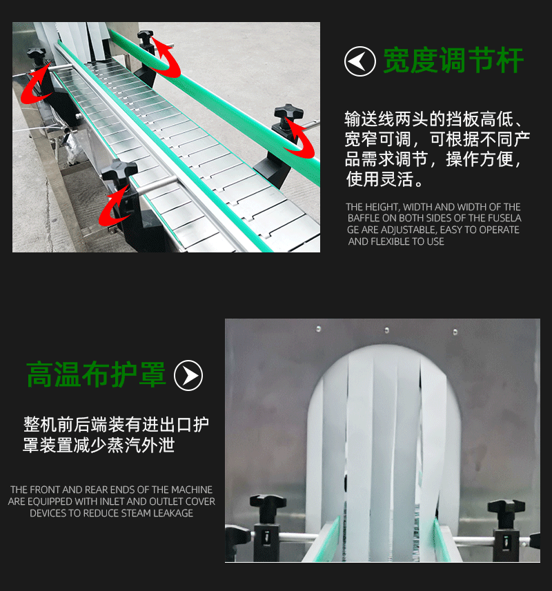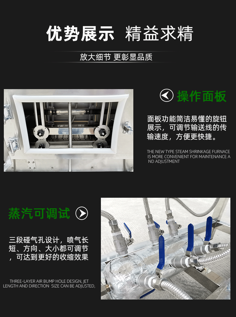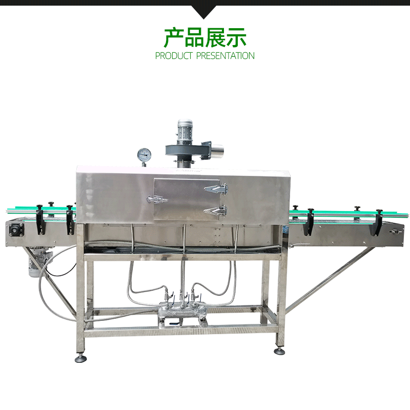 收縮階段:包裝好的產(chǎn)品接著被輸送到蒸汽收縮部分的收縮通道入口。此時,蒸汽發(fā)生系統(tǒng)已經(jīng)產(chǎn)生了合適的蒸汽,蒸汽通過噴頭均勻地噴灑在產(chǎn)品的包裝薄膜上。包裝薄膜在蒸汽的熱量作用下開始收縮,緊密貼合在產(chǎn)品表面。產(chǎn)品在輸送系統(tǒng)的推動下繼續(xù)在收縮通道內(nèi)移動,保證薄膜各個部分都能充分收縮。收縮完成后,通風(fēng)口排出蒸汽,產(chǎn)品在外界環(huán)境下冷卻定型,最終完成蒸汽收縮包裝,從出口輸送帶送出一體機。