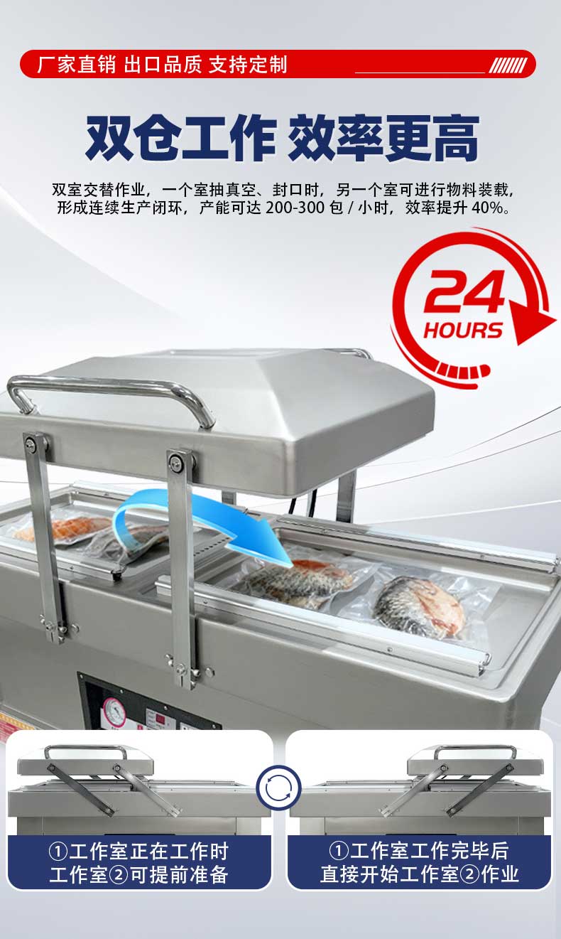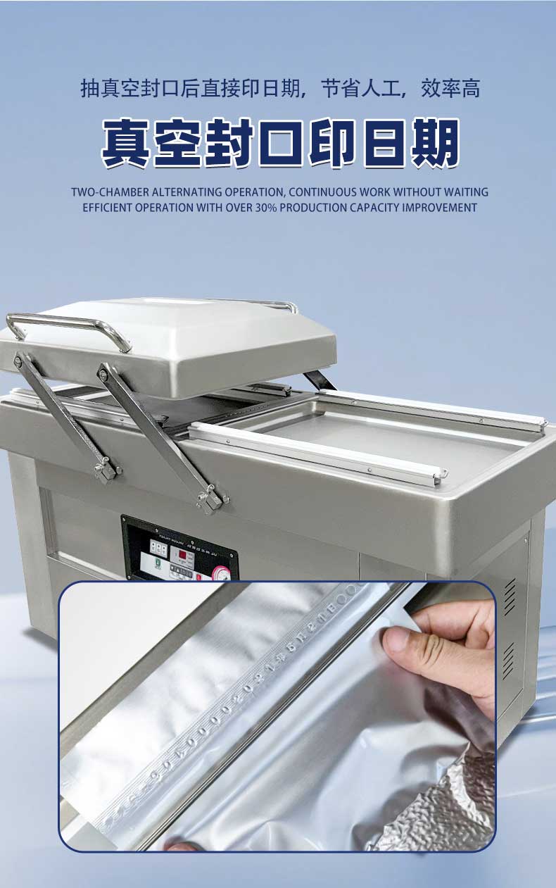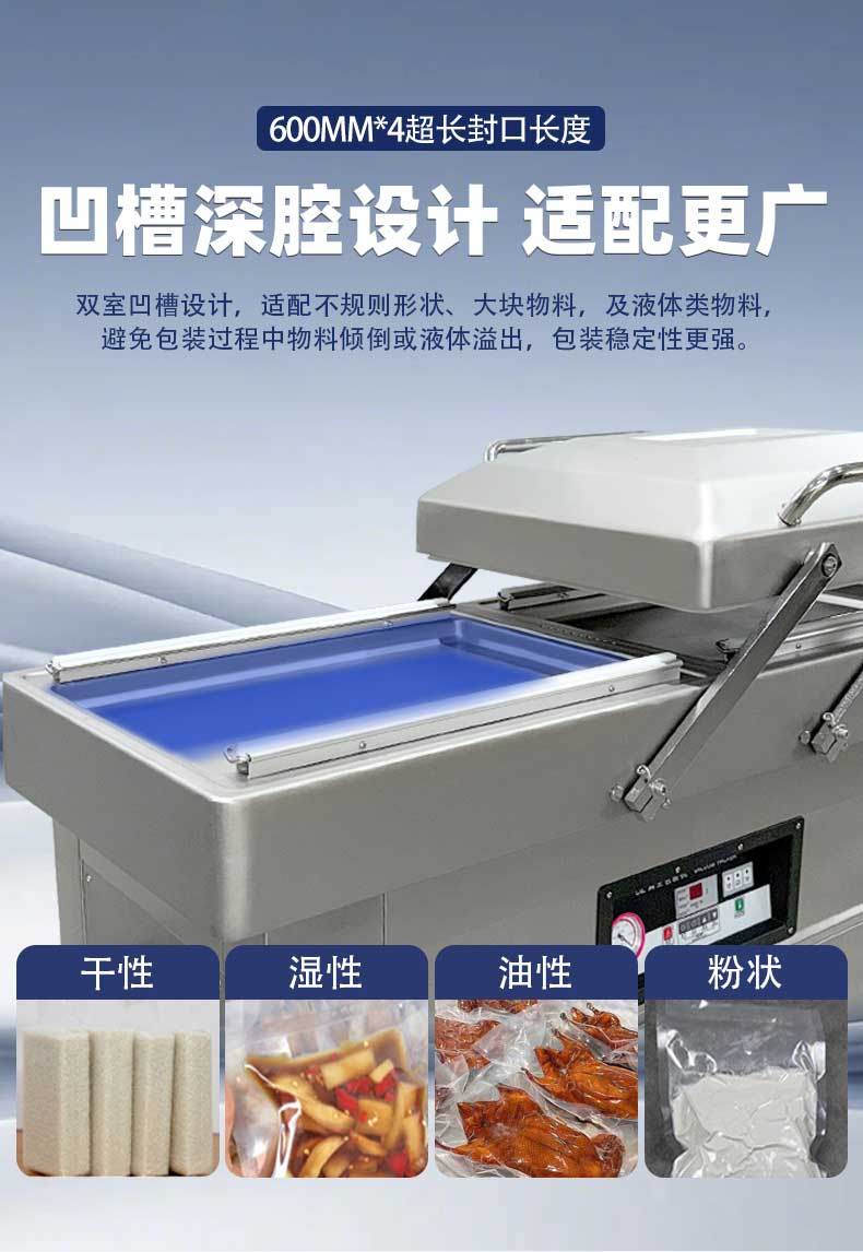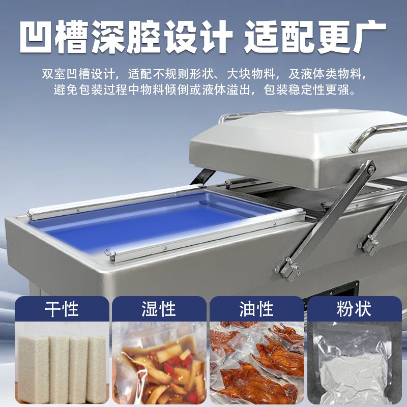 在鹵味飄香的熟食店、水產(chǎn)豐富的漁港作坊、預(yù)制菜量產(chǎn)的食品工廠中,帶湯汁、高水分產(chǎn)品的包裝始終是行業(yè)痛點(diǎn)——傳統(tǒng)真空機(jī)易漏液、效率低、保鮮差的問題,往往導(dǎo)致食材損耗、客訴頻發(fā)。雙室凹槽真空機(jī)專為這類產(chǎn)品量身打造,以“防漏鎖鮮+高效量產(chǎn)”為核心,通過結(jié)構(gòu)創(chuàng)新與技術(shù)升級(jí),成為鹵味、水產(chǎn)、預(yù)制菜行業(yè)的包裝利器。針對(duì)鹵味鹵汁、水產(chǎn)冰衣、預(yù)制菜湯汁等特殊屬性,設(shè)備在真空系統(tǒng)、密封結(jié)構(gòu)、操作邏輯上實(shí)現(xiàn)全維度優(yōu)化,從源頭規(guī)避包裝風(fēng)險(xiǎn)。