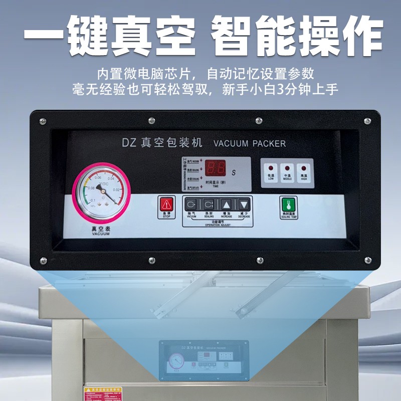操作上采用全智能控制面板,可預(yù)設(shè)抽真空時(shí)間、真空度、封口溫度等10組常用參數(shù),新手只需一鍵啟動(dòng)。