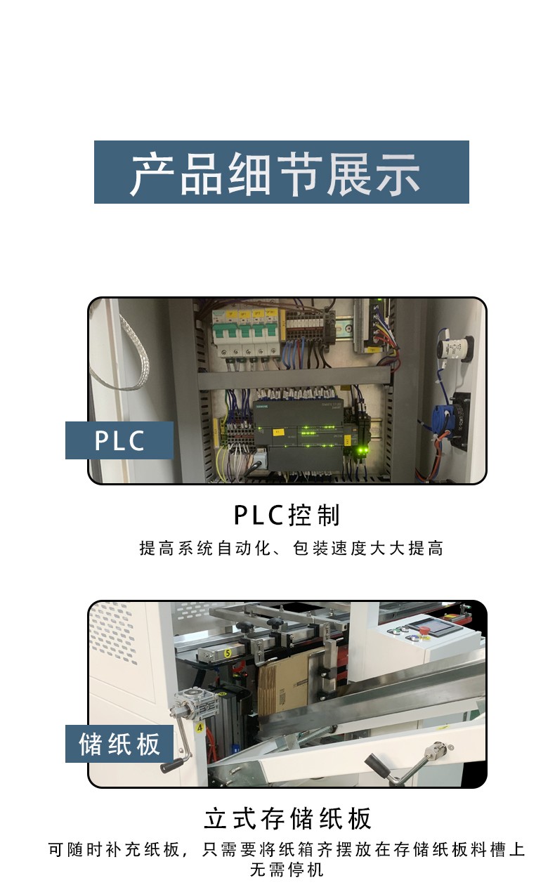 自動(dòng)開箱封底機(jī)一次完成紙箱吸箱、開箱、成型、折底、封底等包裝工序,可大大減少生產(chǎn)人員和勞動(dòng)強(qiáng)度。