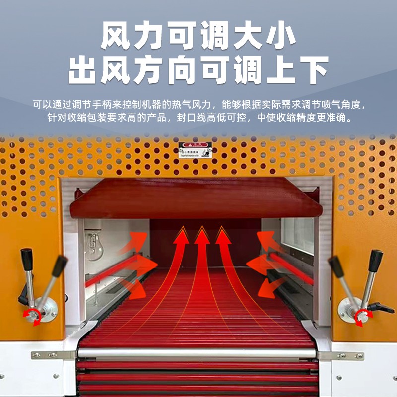 設(shè)備搭載兩個(gè)獨(dú)立變頻器,分別精準(zhǔn)調(diào)節(jié)輸送電機(jī)與加熱吹風(fēng)電機(jī)的轉(zhuǎn)速,徹底解決傳統(tǒng)機(jī)型“單變頻聯(lián)動(dòng)控制”下“調(diào)速必調(diào)溫、調(diào)溫影響調(diào)速”的核心痛點(diǎn)。一方面,輸送速度可實(shí)現(xiàn)無(wú)級(jí)獨(dú)立調(diào)節(jié),加熱功率隨溫度傳感器實(shí)時(shí)反饋數(shù)據(jù)動(dòng)態(tài)適配,能針對(duì)不同產(chǎn)品尺寸(小至電子配件、大至整箱禮盒)、不同薄膜材質(zhì)(POF、PE、PVC等)靈活匹配參數(shù)——如小型五金件可快速輸送+低溫收縮避免薄膜焦化,大型紙箱可慢速通過(guò)+高溫均勻收縮杜絕邊角收縮不達(dá)標(biāo);另一方面,溫度控制精度可達(dá)±1℃,吹風(fēng)方向支持多維度定向調(diào)節(jié),三者協(xié)同確保薄膜從邊角到平面同步收縮,包裝成品平整無(wú)褶皺、貼合無(wú)氣泡。