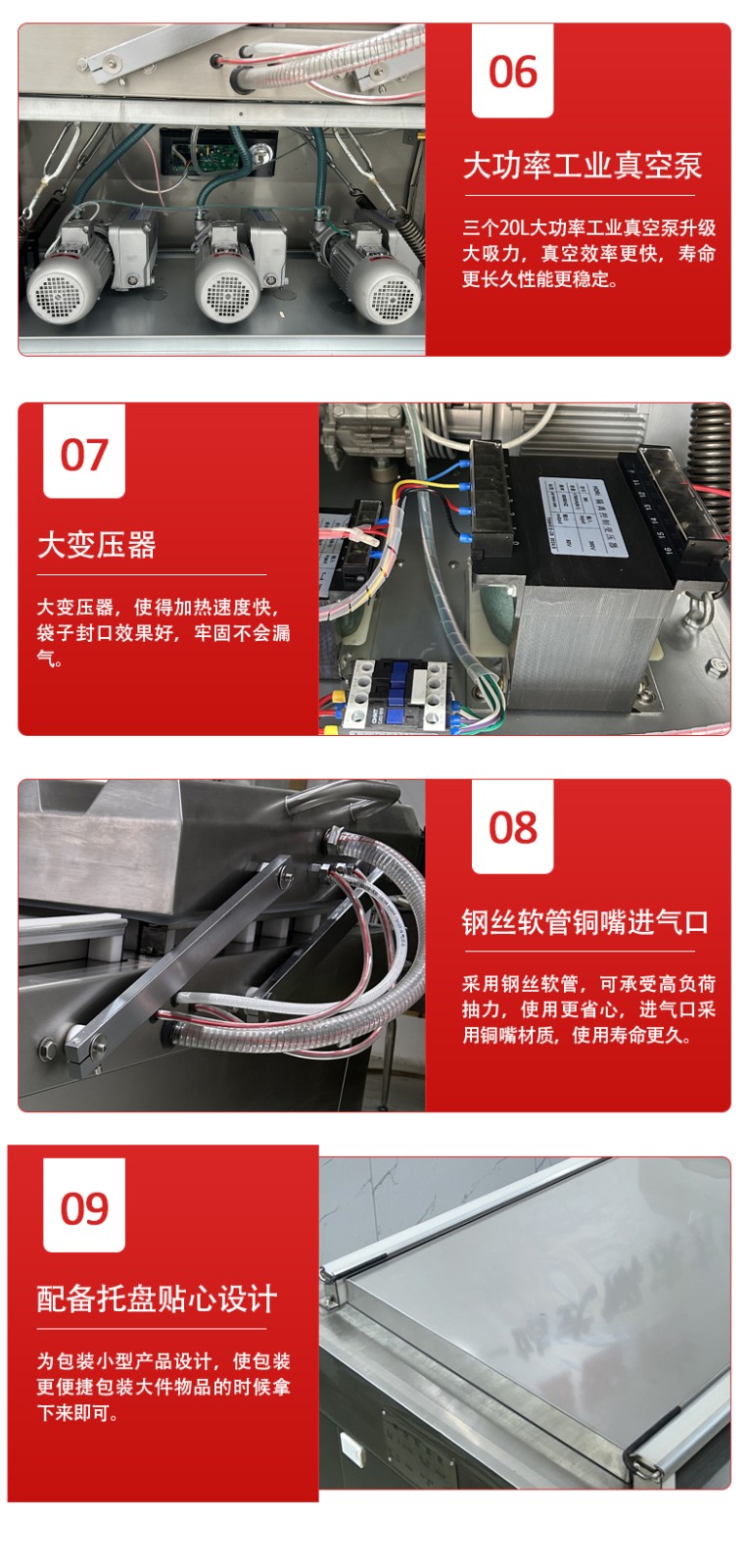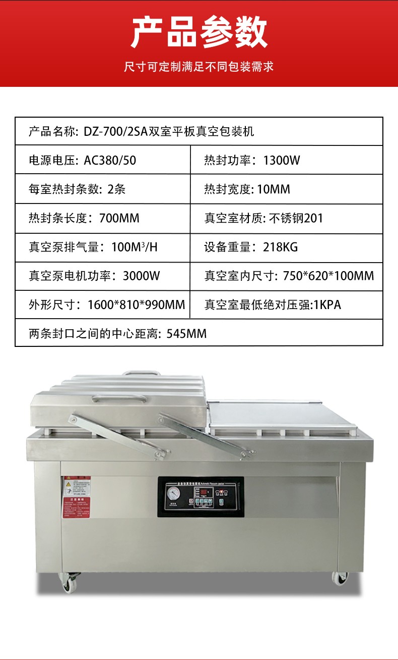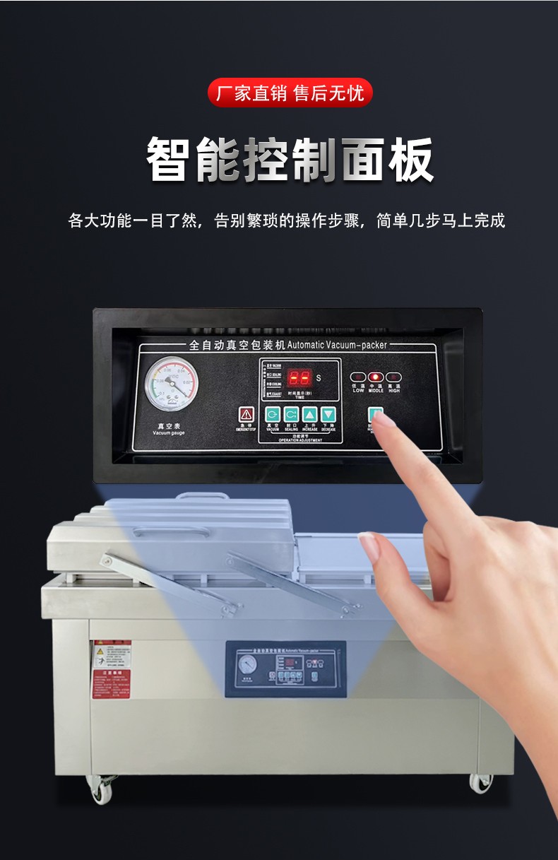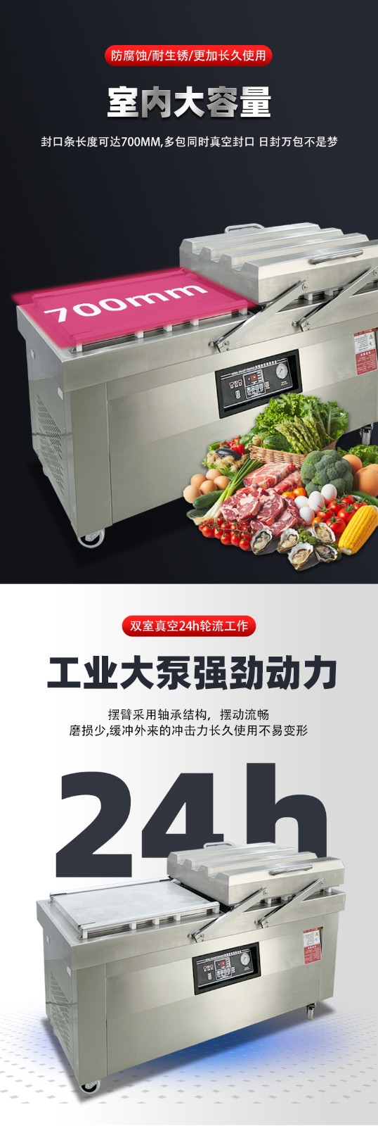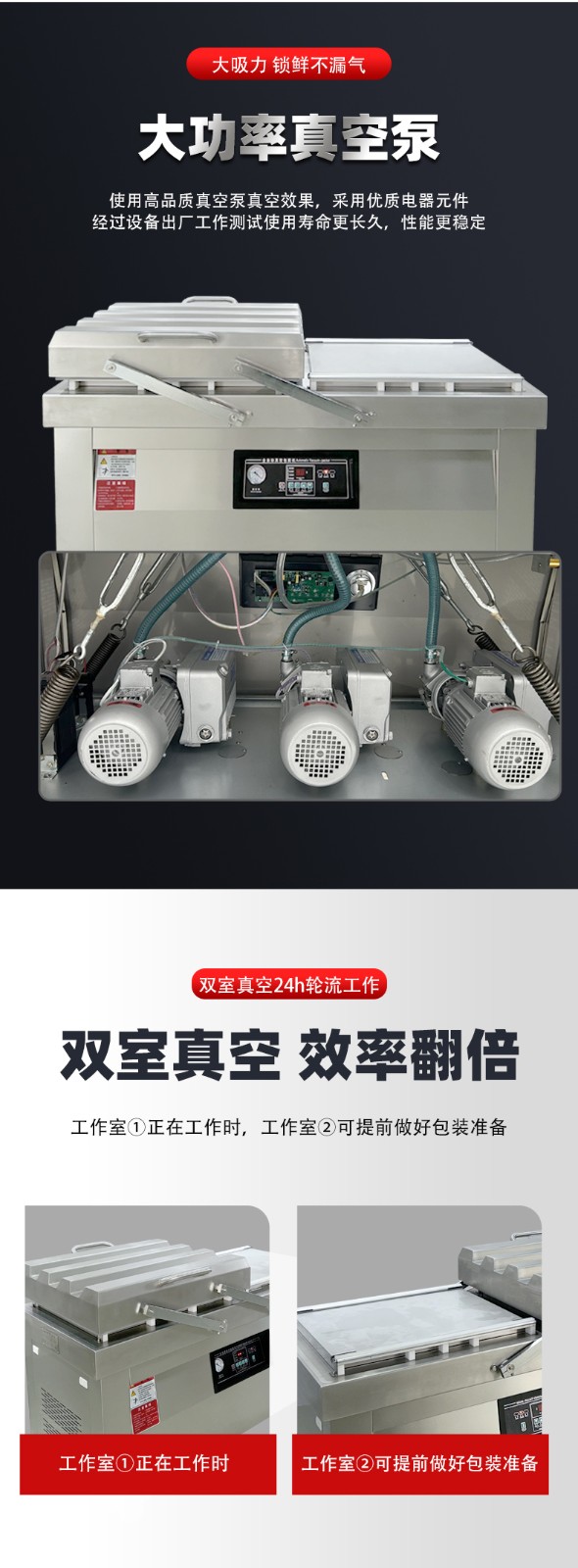 - 交替作業,效率提升 50% 以上雙室機型的兩個真空室可實現 “一工一備”:當其中一個真空室正在進行抽真空、熱封作業時,操作人員可以在另一個真空室完成物料擺放、袋口整理的準備工作。單室機型則必須等抽真空 - 熱封 - 開蓋取件整個流程結束后,才能進行下一批物料的擺放,存在明顯的操作等待空窗期。同等規格下,雙室機的單位時間包裝量是單室機的 1.5-2 倍,尤其適合中小型加工廠的連續批量生產。