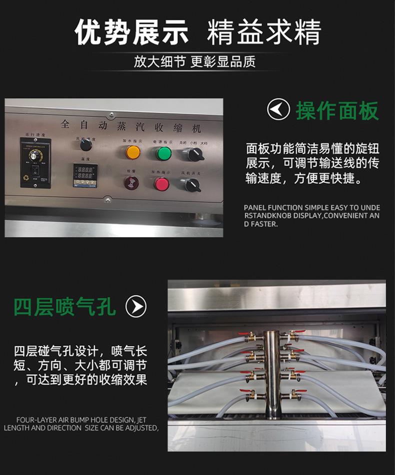 良好的包裝質量:通過精確的封切裝置,可以確保包裝薄膜密封良好,為產品提供可靠的防護。蒸汽收縮過程使薄膜緊密貼合產品,有效增強了包裝的牢固性,防止產品在運輸和儲存過程中受到損壞,同時還能提升產品的外觀整潔度和吸引力。