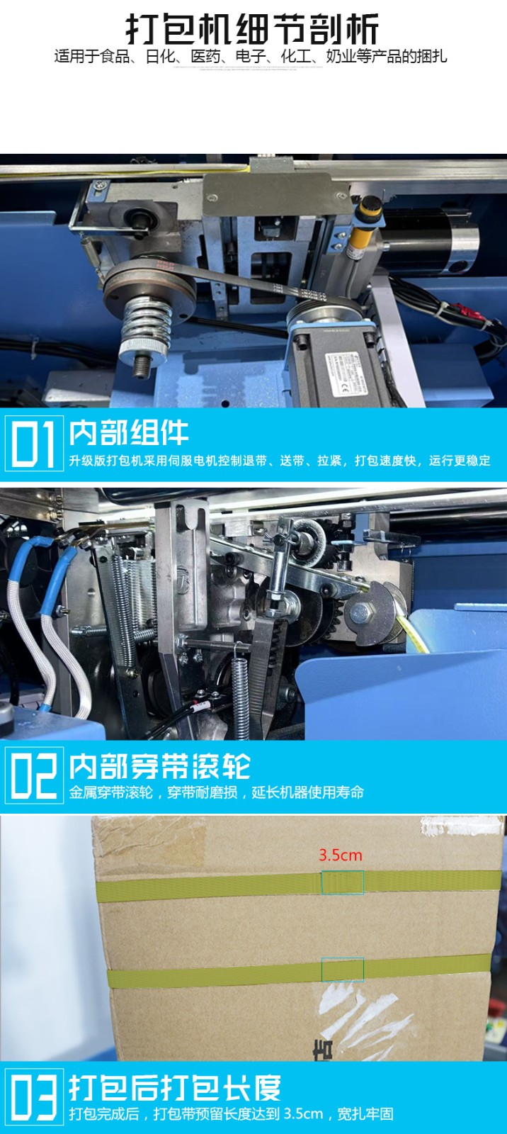 - 捆扎打包:根據(jù)預(yù)設(shè)的參數(shù),伺服電機(jī)驅(qū)動打包帶圍繞物品進(jìn)行捆扎。在捆扎過程中,伺服電機(jī)精確控制打包帶的張力,確保打包帶能夠緊密地貼合在物品表面,同時又不會對物品造成損壞。完成捆扎后,切斷機(jī)構(gòu)會自動將打包帶切斷,并對末端進(jìn)行熱封或其他方式的處理,防止打包帶松開。