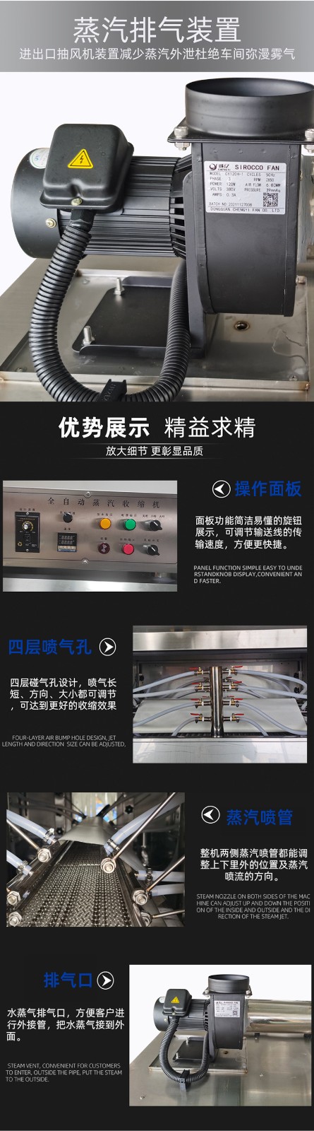 - 智能控溫,適配多類膜材配備 PLC 智能控制系統,可精準調節蒸汽溫度(50℃-120℃可調)、輸送速度與蒸汽噴射量,兼容 POF、PVC、PE 等多種熱收縮膜材,滿足不同產品的包裝厚度與質感要求。