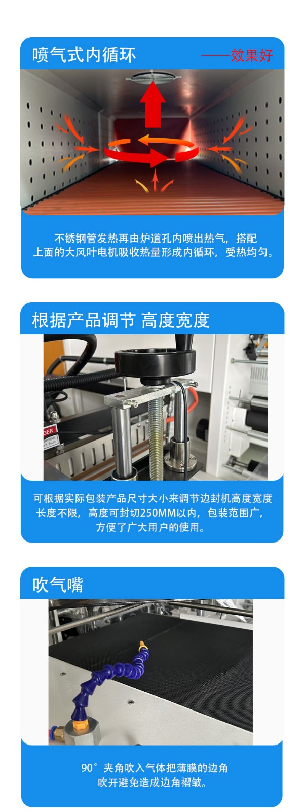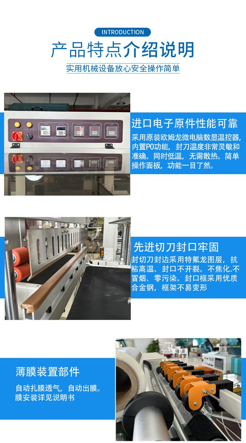 - 當(dāng)薄膜包裹好產(chǎn)品后,邊封裝置開始工作。加熱元件迅速將封刀加熱到預(yù)設(shè)的邊封溫度,這個(gè)溫度是根據(jù)薄膜的材質(zhì)和厚度來(lái)確定的。例如,對(duì)于 PVC 薄膜,邊封溫度通常在 180 - 220℃之間;對(duì)于 POF 薄膜,溫度一般在 160 - 200℃左右。